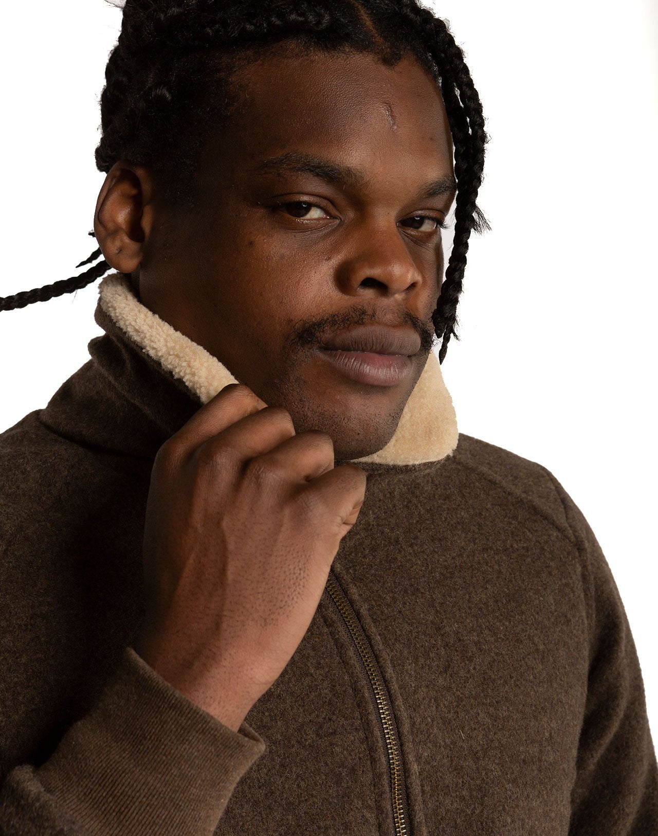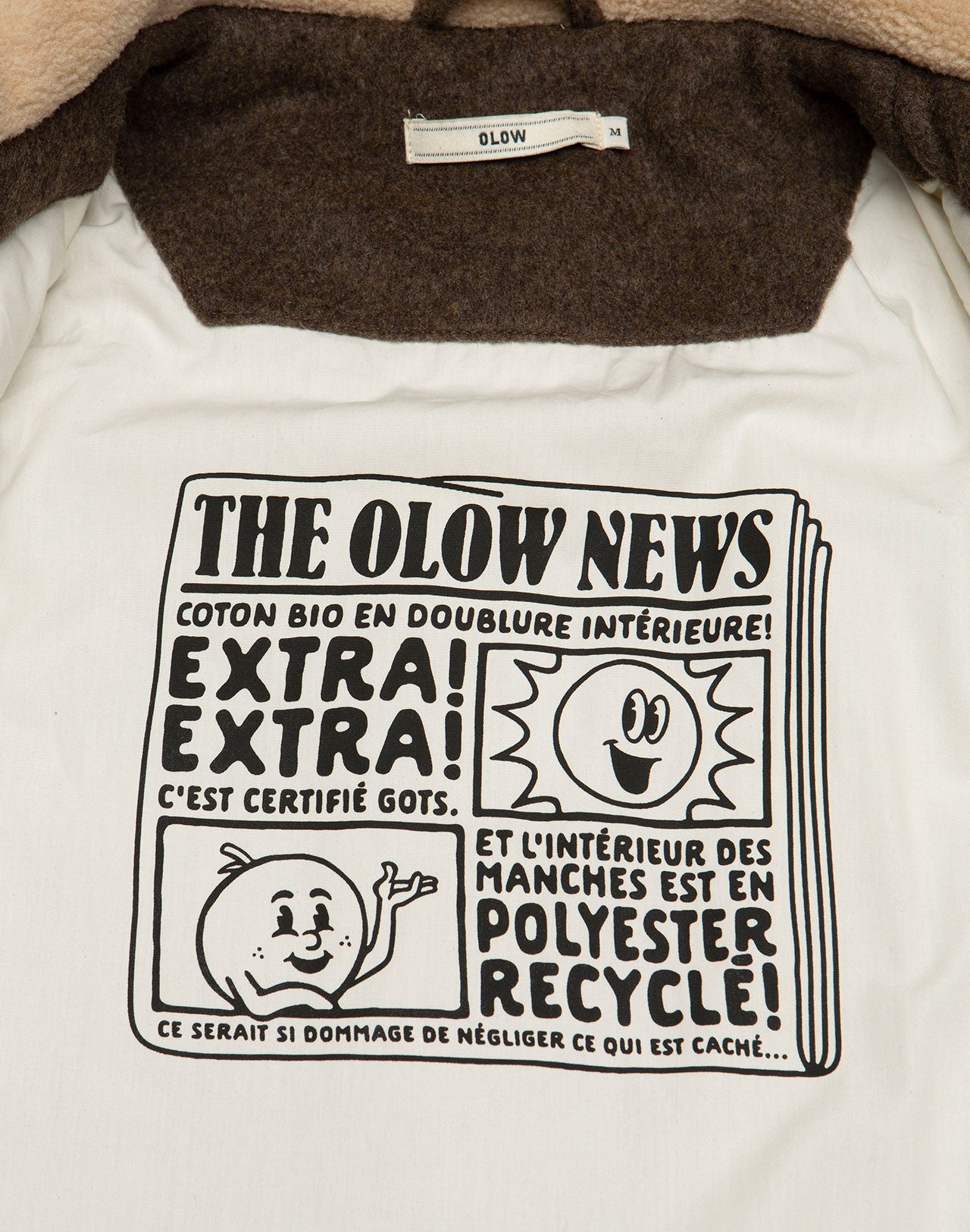 Blouson marron type aviateur. Intérieur avec impression sérigraphie et poche avec étiquette à message. Col avec pression. Poches latérales.