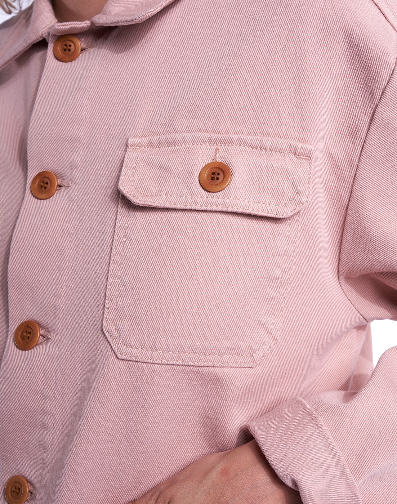Veste de travail rose avec étiquette à message sur la poche à l'intérieur, boutons en corozo naturel, Poches plaquées latérales et poitrine.