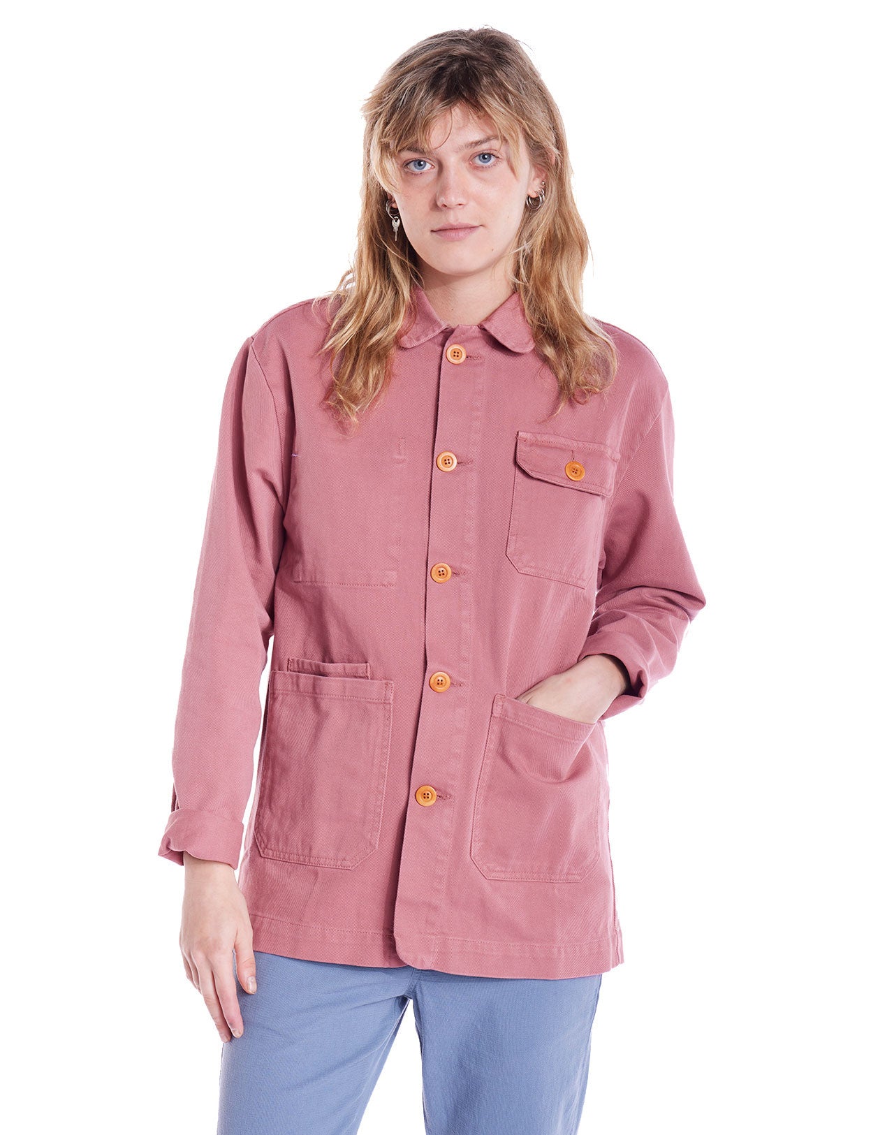 Veste de travail grenat avec étiquette à message sur la poche à l'intérieur, boutons en corozo naturel, Poches plaquées latérales et poitrine.