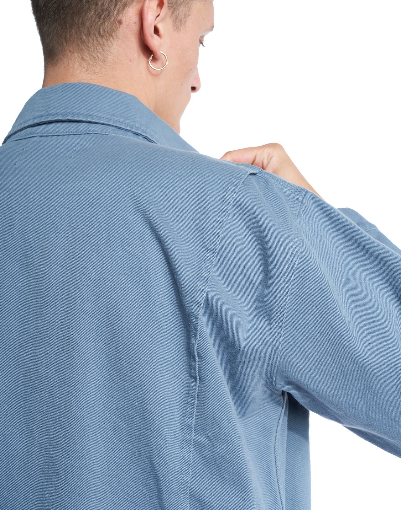 Veste bleue grise avec poches poitrines à rabats et poches latérales plaquées. Étiquette à message sur la poche intérieure. Surpiqûres dos..