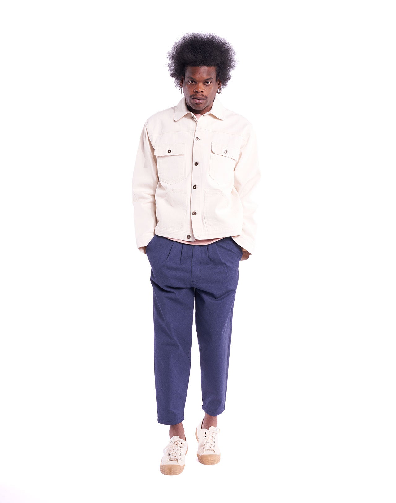 Veste écrue avec poches poitrines à rabats et poches latérales plaquées. Étiquette à message sur la poche intérieure. Surpiqûres dos.
