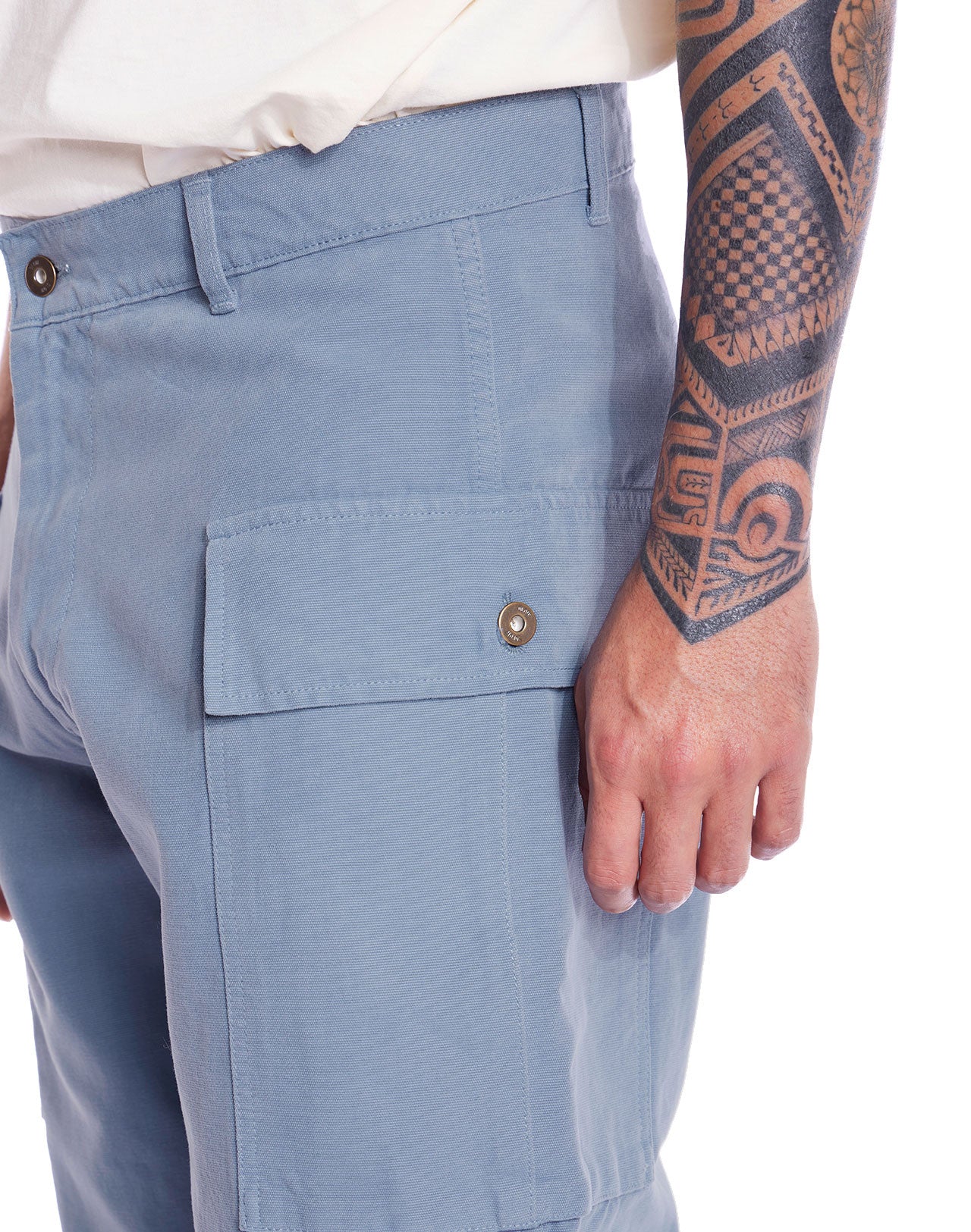 Pantalon type cargo avec larges poches latérales plaquées. Coupe large.