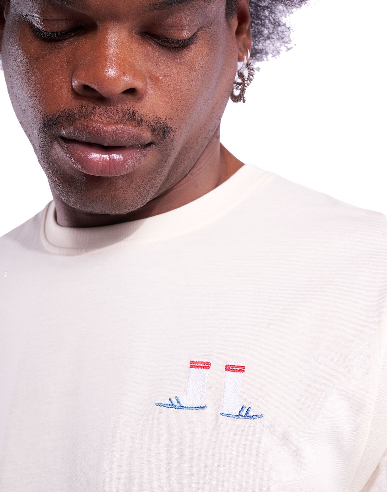 T-shirt col rond ivoire avec broderie poitrine et impression digitale au dos.