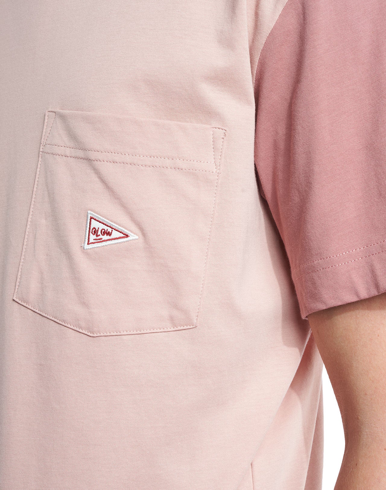 T-shirt col rond rose et grenat, poche poitrine avec patch Olow. Coupe ample.