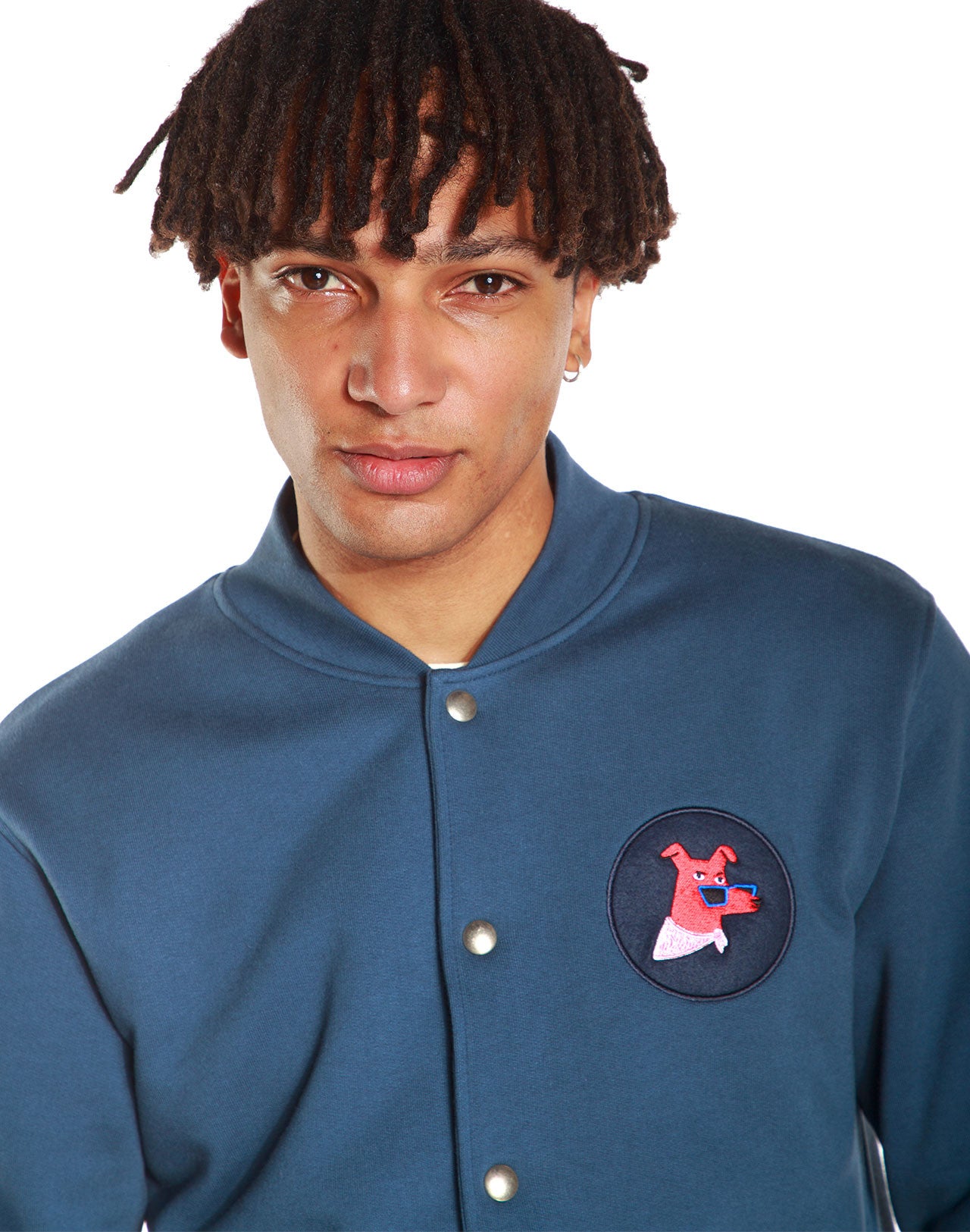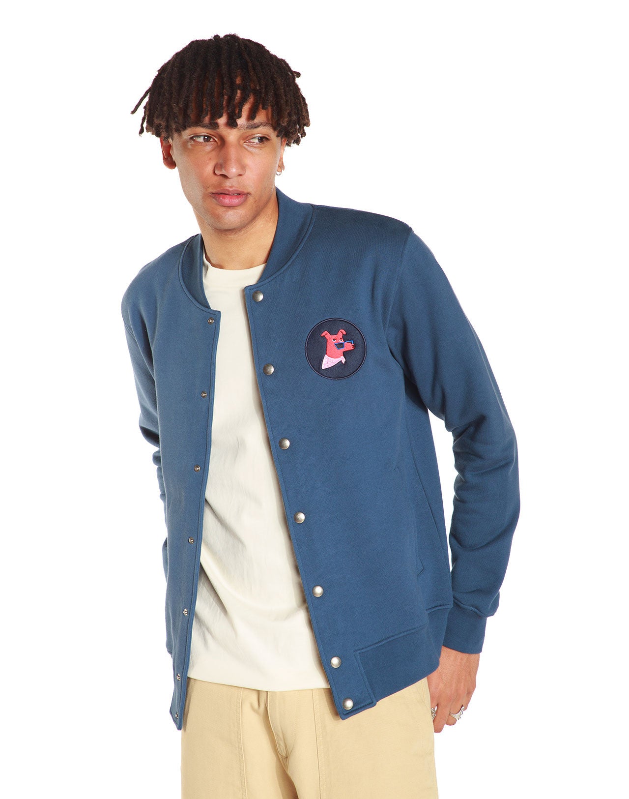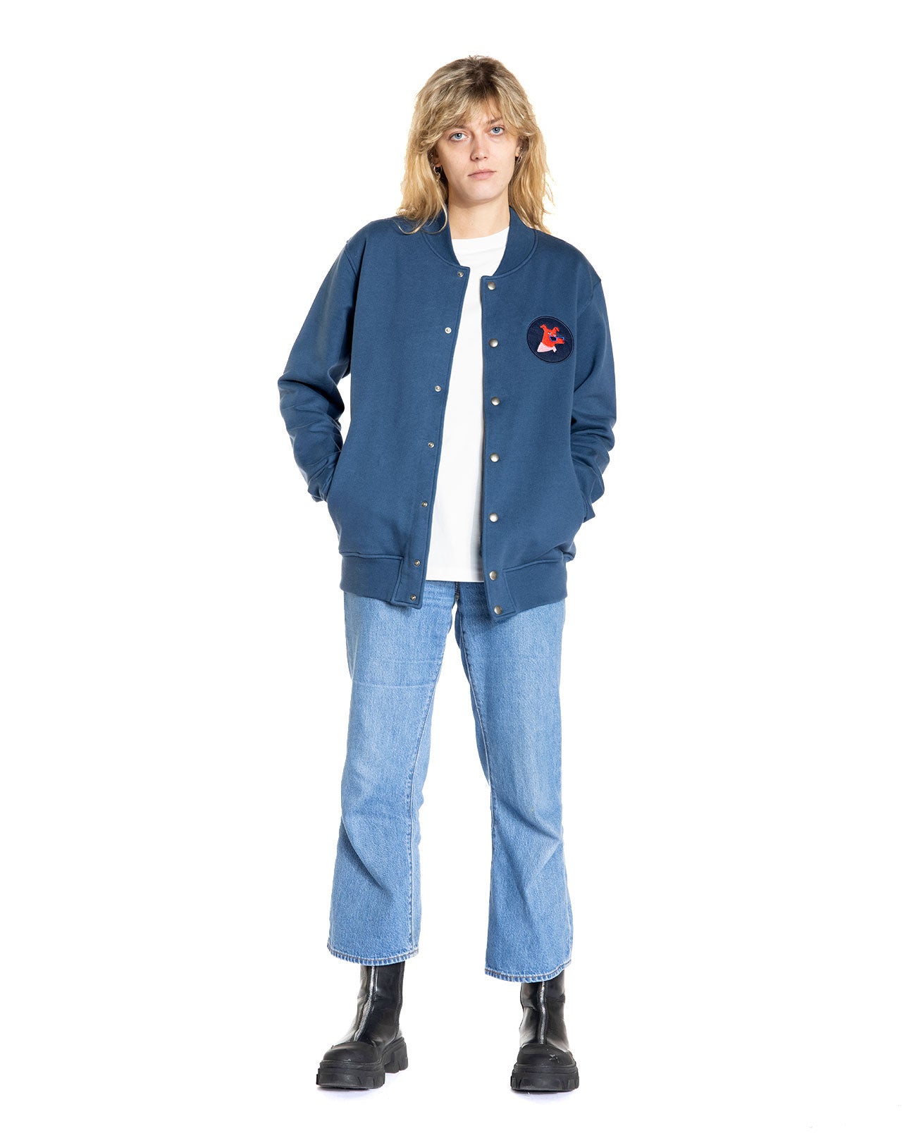 Veste bleue indigo avec patch brodé. Col Teddy et boutons pressions. Poches passepoilées.