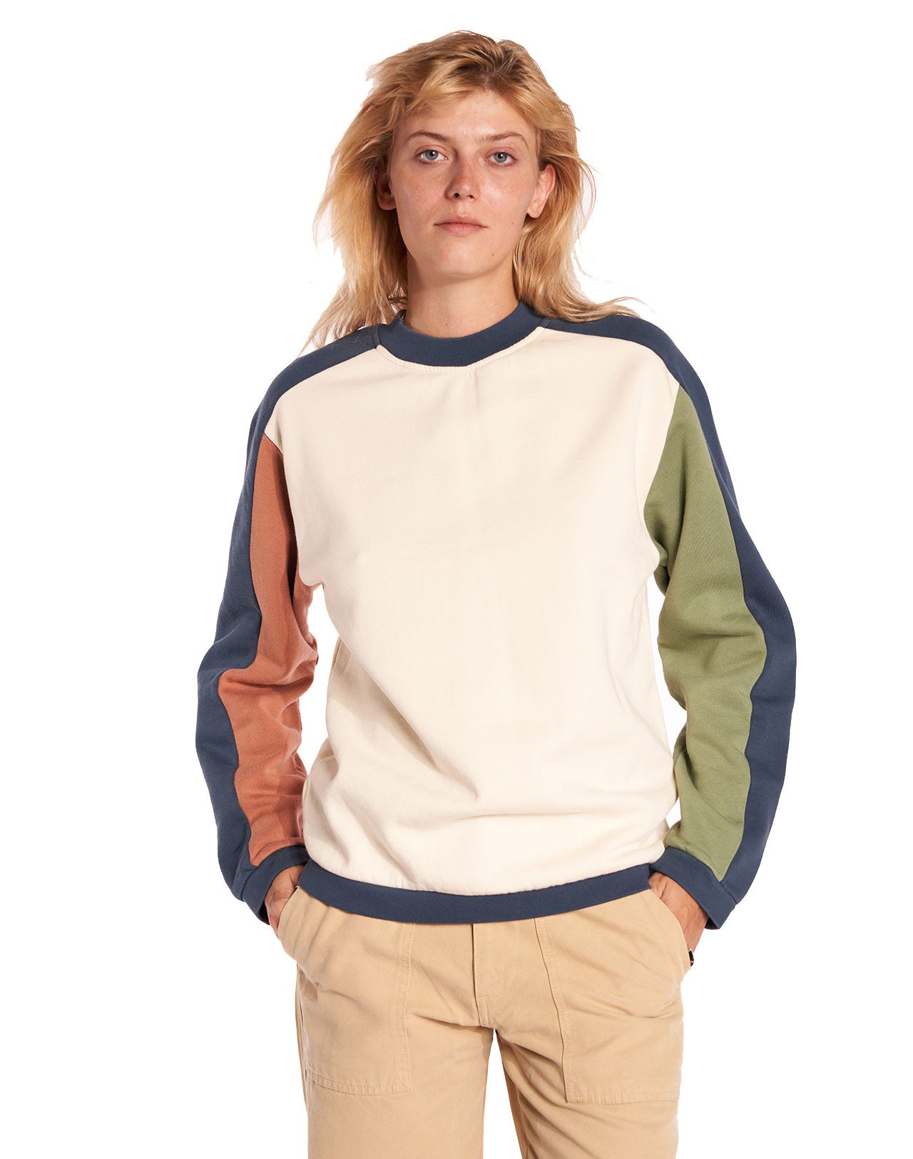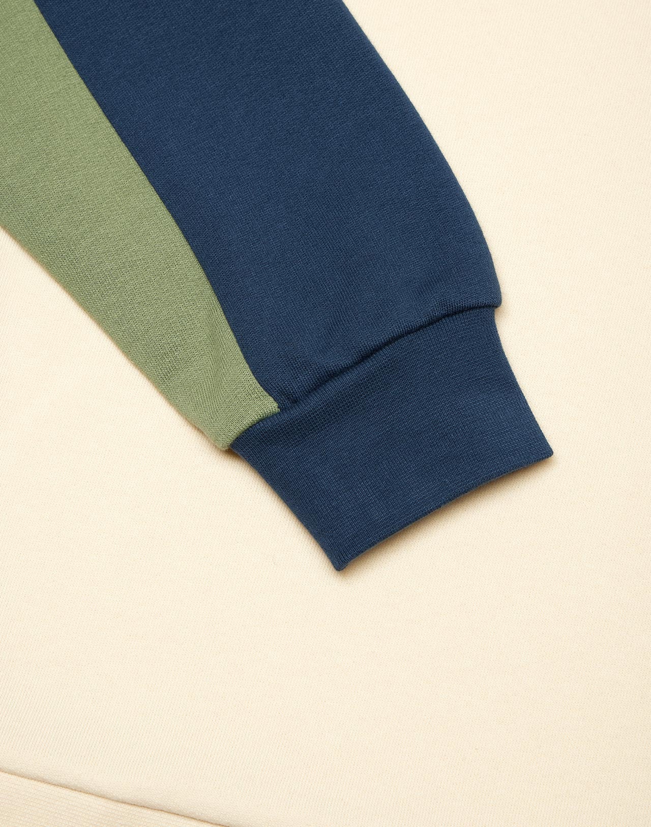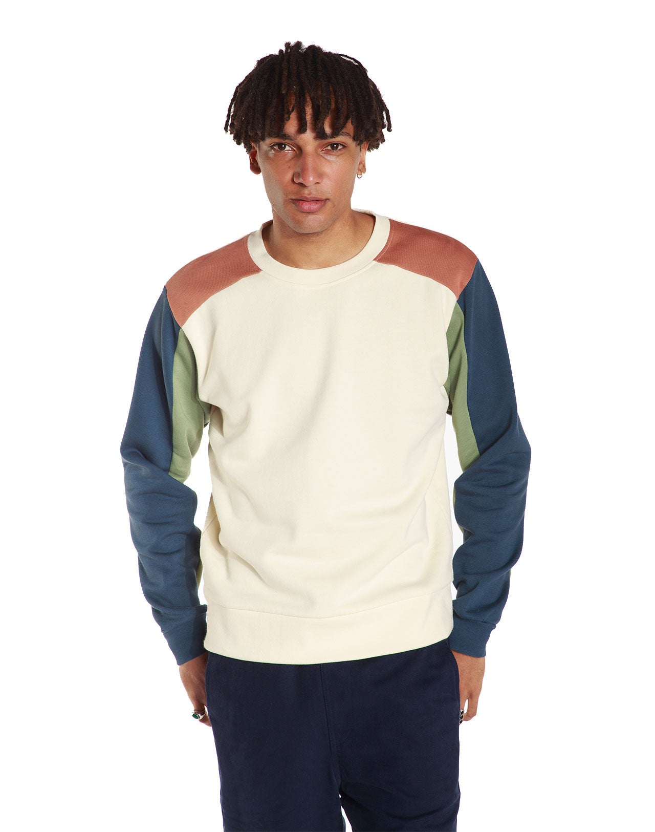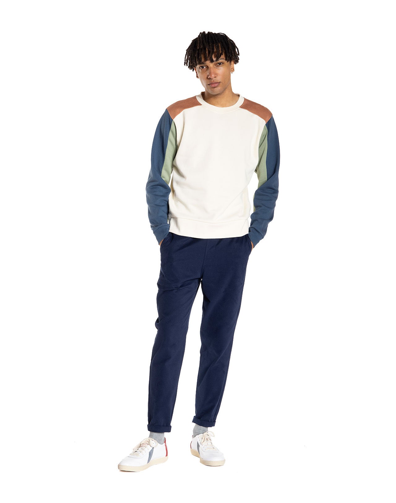 Sweat ivoire, pêche, vert sauge et bleu marine au style vintage.