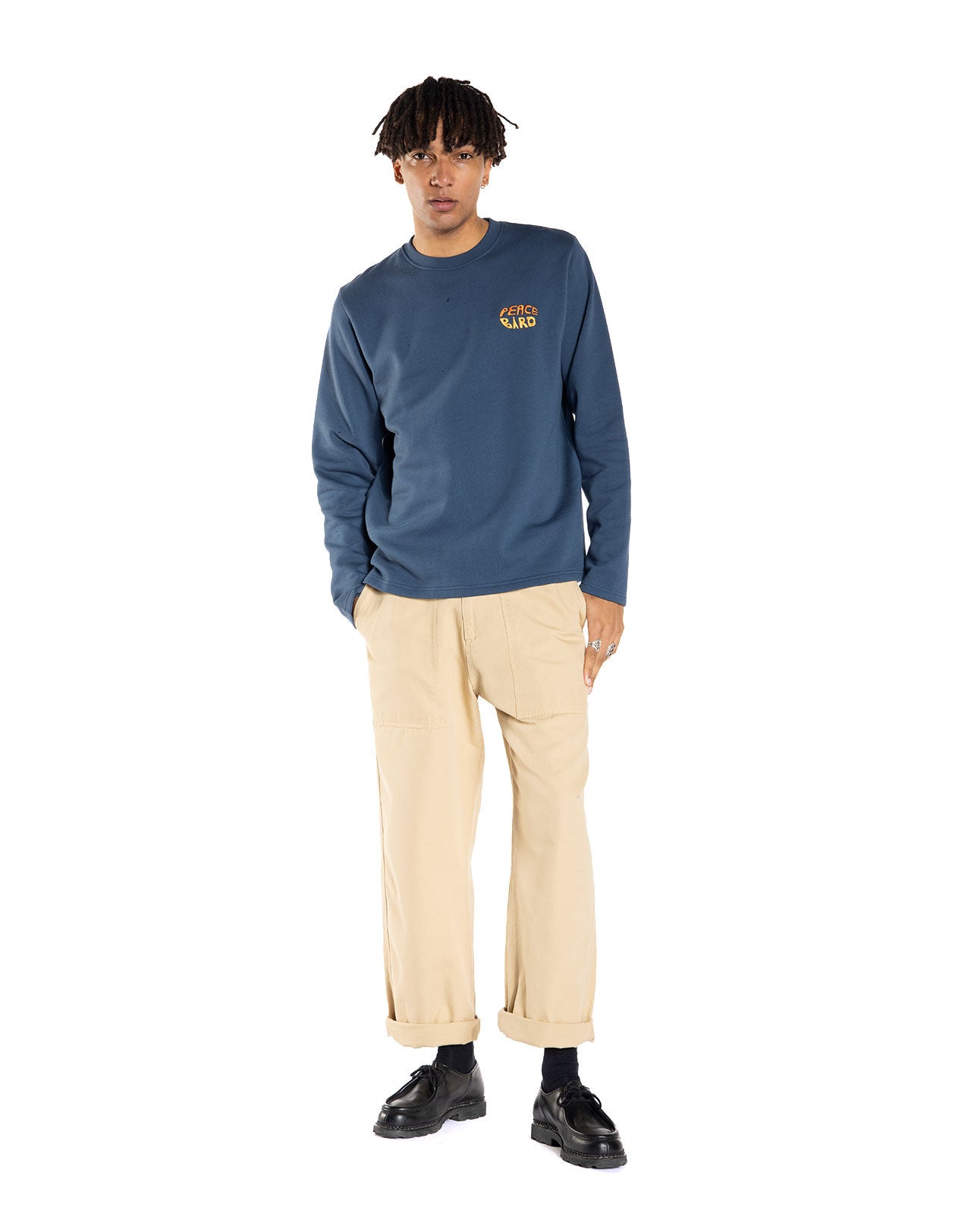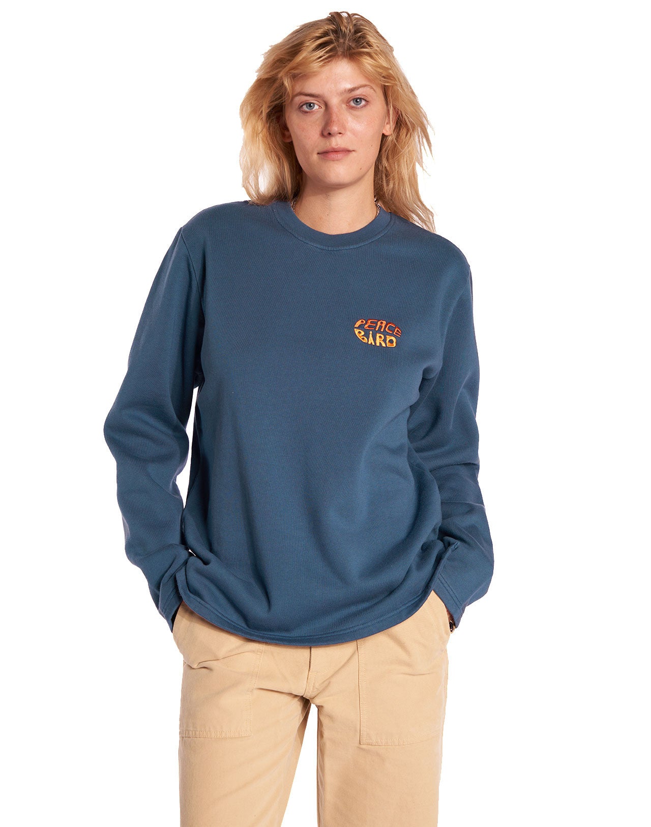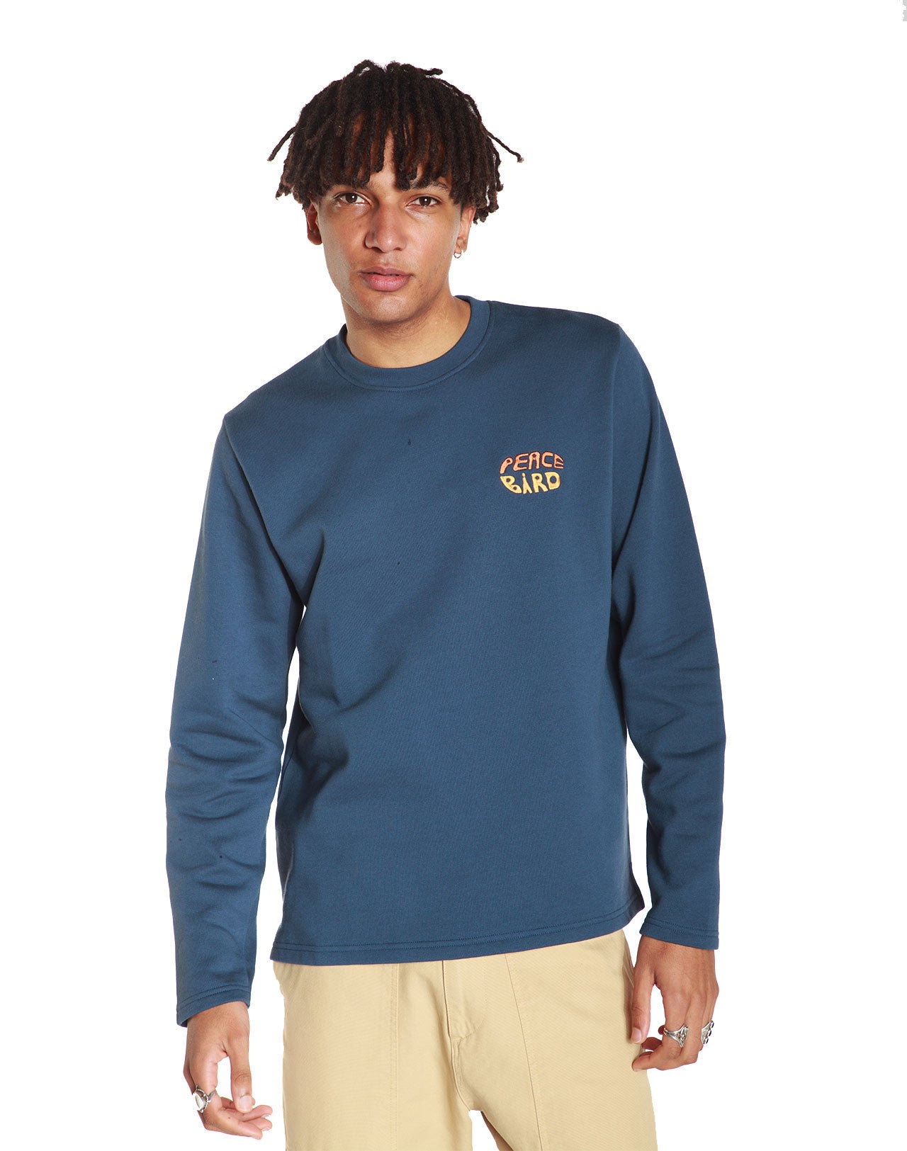 Sweat bleu indigo avec broderie poitrine et sérigraphie dans le dos.