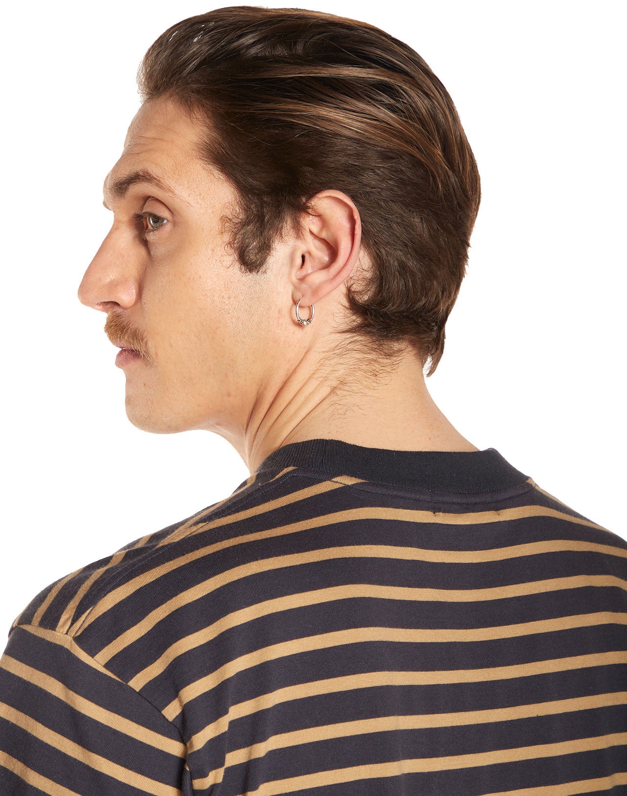 T-shirt col rond noir carbone avec rayures sables. Poche poitrine.