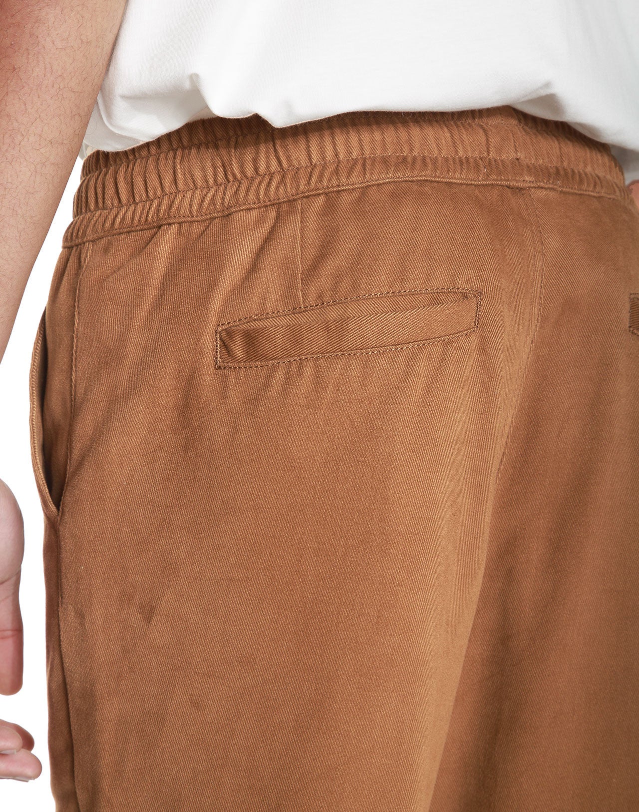 Pantalon fuselé marron. Cordon de serrage écru à la ceinture et taille élastique.