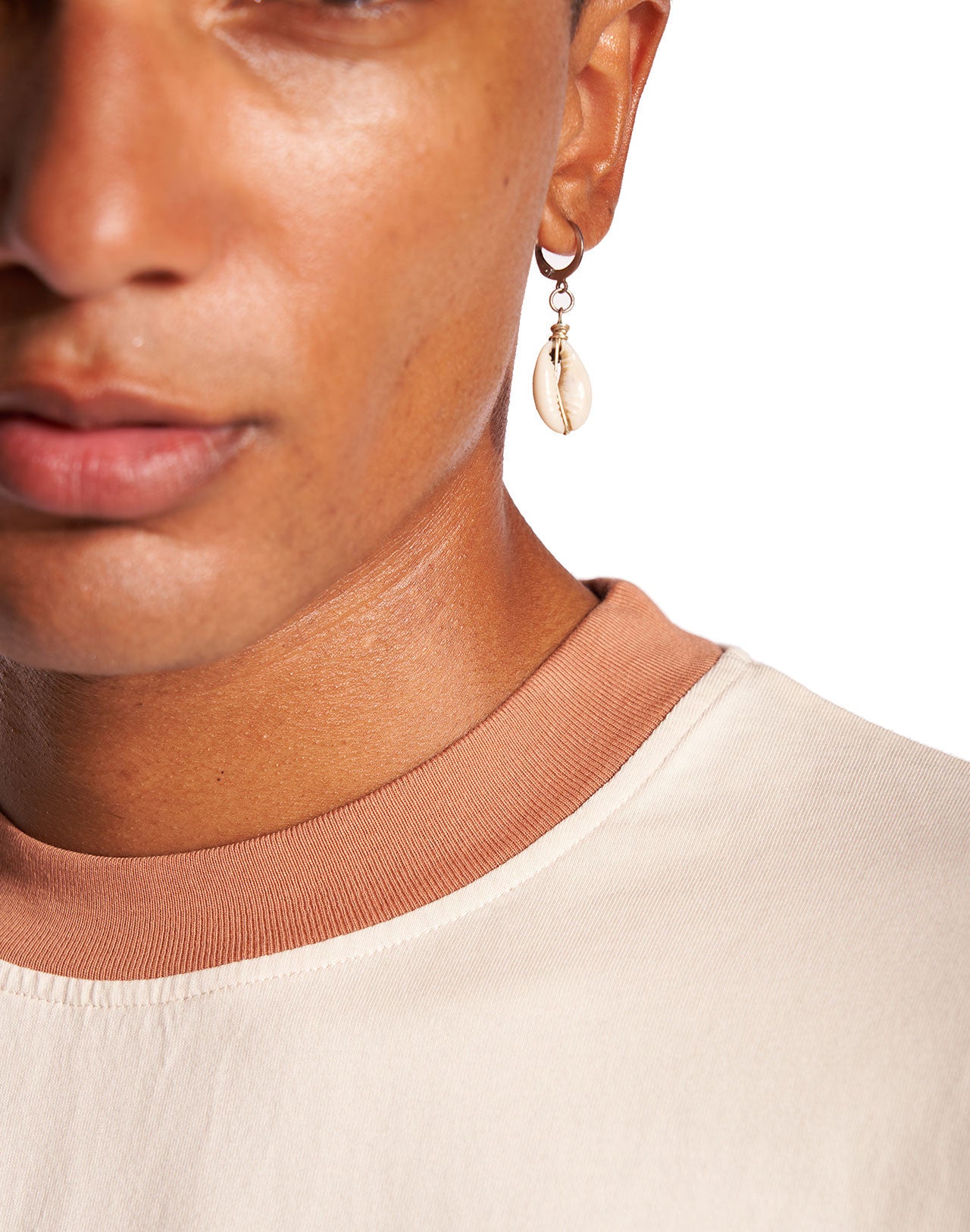 T-shirt col rond ivoire avec manches et col pêche. Patch Olow en feutrine.