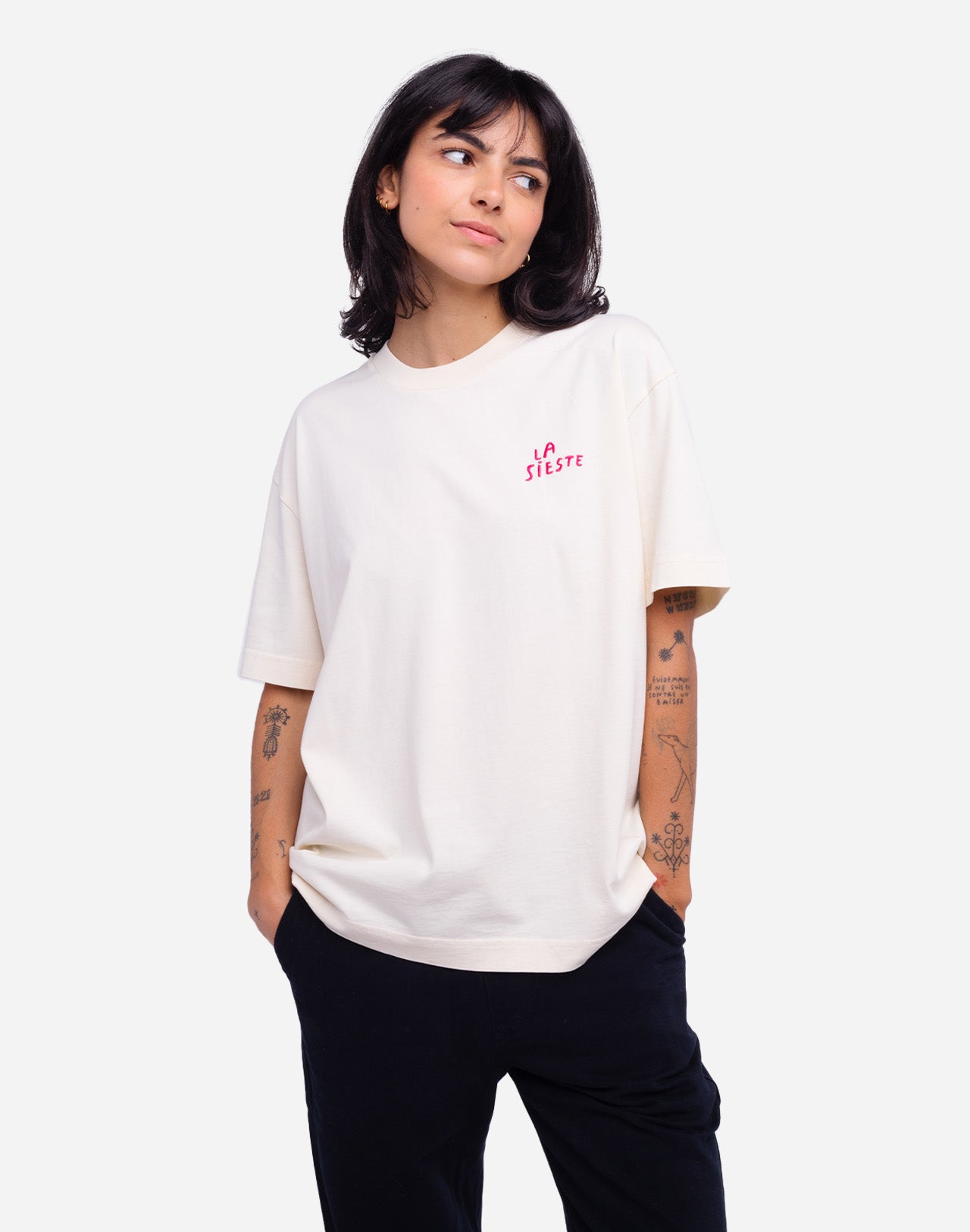 Aller barouder, oui, faire la sieste, oui aussi. L'illustration farniente de l'artiste Twotma sur un t-shirt ample en coton bio