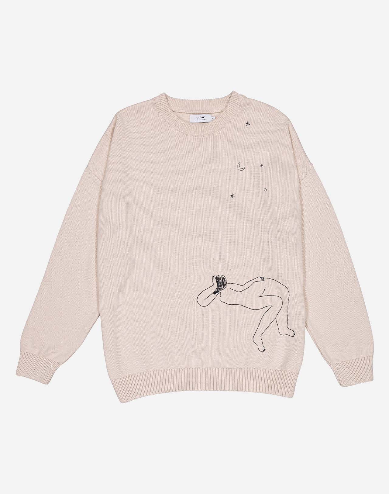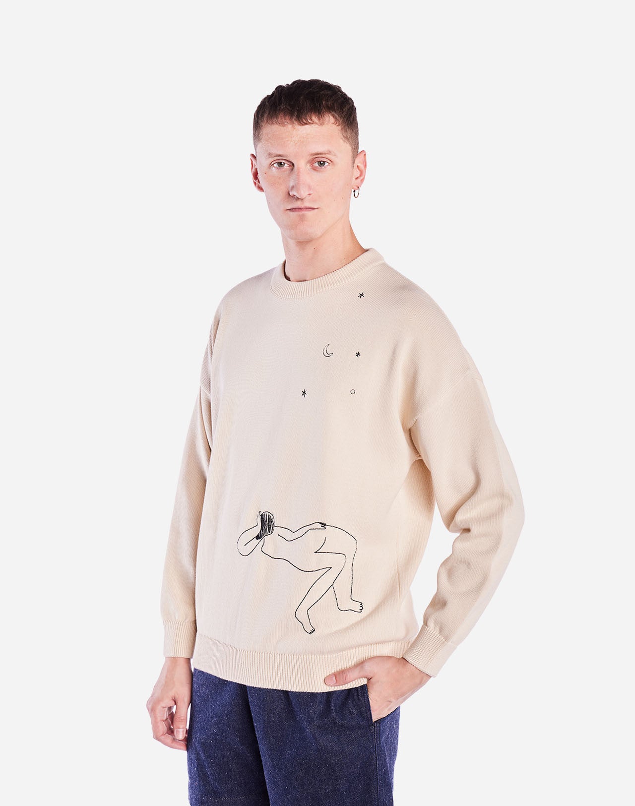 Ce personnage assoupi, dessiné par l'artiste Eniko Katalin Eged, prend vie sur ce pull en coton bio. Une broderie fine qui apporte son plus à ce vêtement, mélant art et confort.