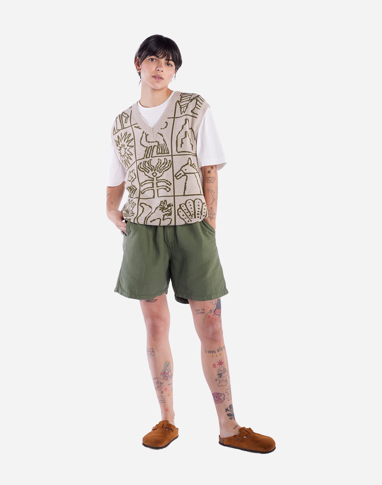 On ne se lasse pas du trait de l'artiste Madeleine Kemsley. Ici, sublimant un pull sans manche en coton bio, vintage à souhait, mais sans être kitsch pour un sous.