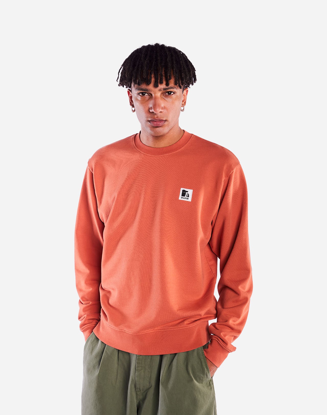 Un sweat en coton bio GOTS comme un autoportrait, aborant fièrement le visage de OLOW