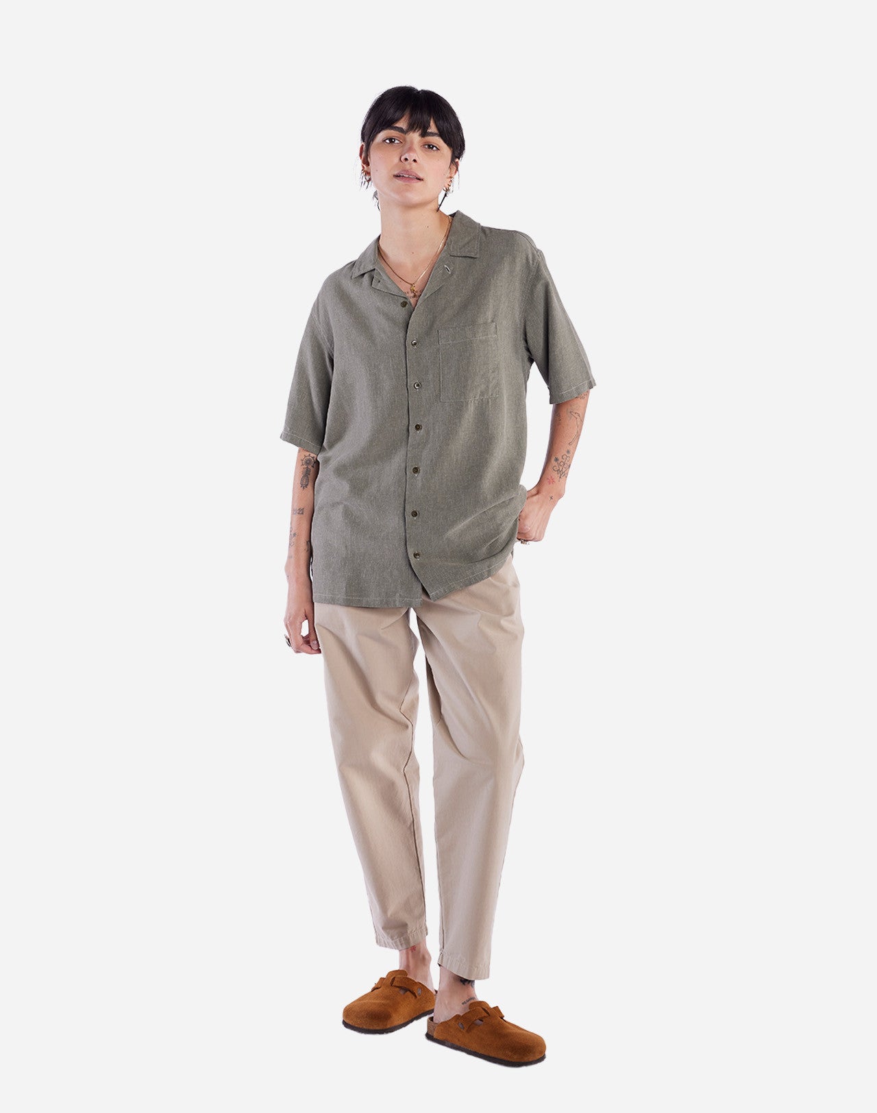 De sa couleur eucalyptus à sa matière qui allie le tencel et le chanvre, pour un tissu extrèmement doux et respirant, cette chemisette à elle toute seule donne envie de ralentir.